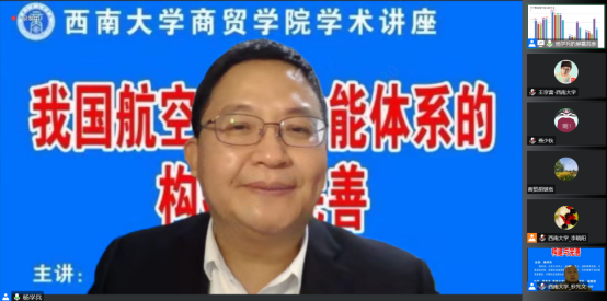 杨学兵从加快建设国际和区域枢纽机场对于推动《扩大内需战略规划纲要(2022-2035年)》实施的意义出发,解析了航空枢纽的概念、内涵与评判标准,详细介绍了我国目前航空枢纽体系的现状和问题。杨学兵还提出可从集聚各方优势资源、完善国家综合机场体系、关注挖掘长尾市场、加快空铁融合发展等方面,进一步完善航空枢纽功能体系。讲座结束后,杨学兵与师生们进行了线上互动,就成渝地区航空枢纽体系建设、民航与高铁的竞合关系等问题进行了深入交流。