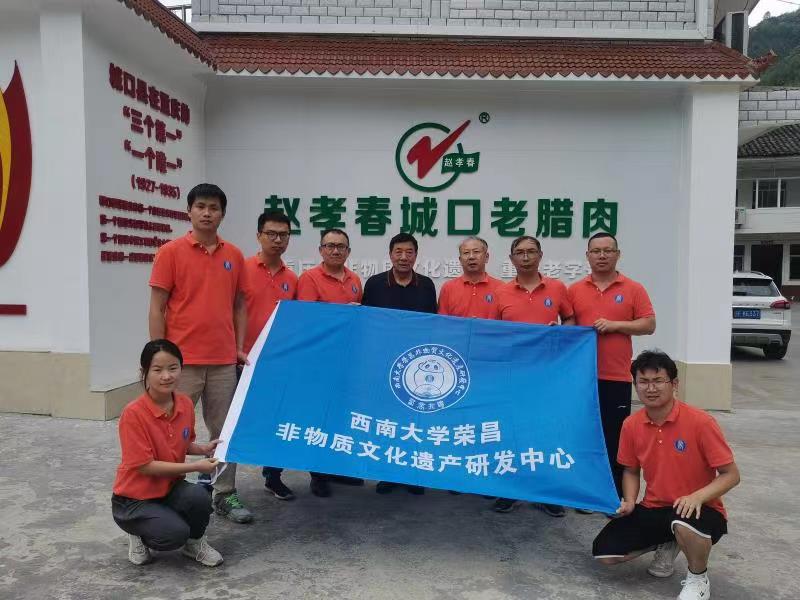 随后实践团调研了重庆市非物质文化遗产——城口老腊肉加工工艺,并与全国劳模第五代传承人赵孝春充分交流。近年来,重庆市城口县赵孝春野生食品开发有限公司累计为200余户贫困户提供猪仔达600头,实现了1亿元的营业额、1000万元税额并帮助了100户贫困户脱贫致富,利用非物质文化遗产促进当地经济发展,助力乡村振兴。
