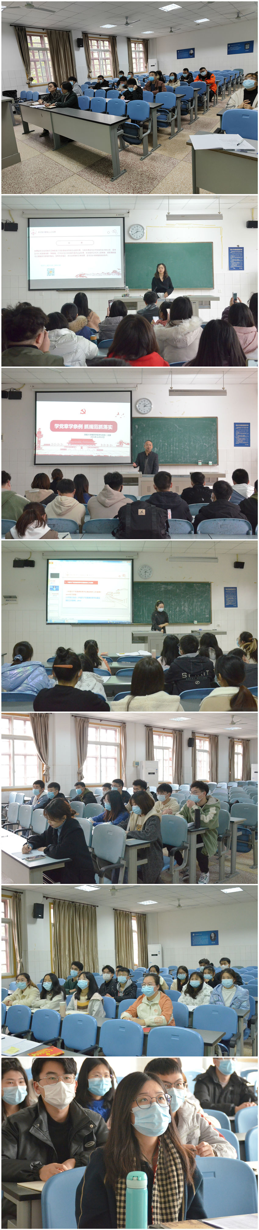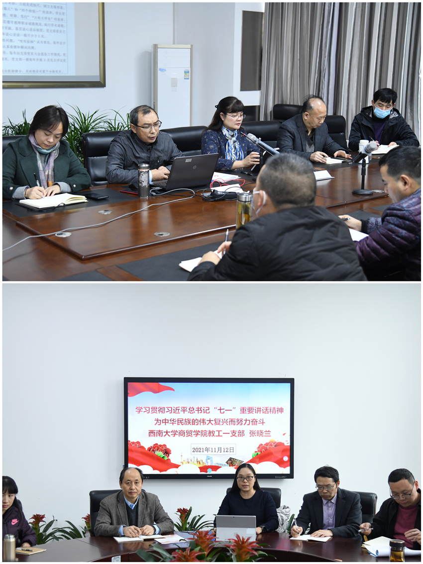 各党员同志在集中缴纳党费后,通过观看视频等方式学习了《中国共产党章程》、《中国共产党简史》关于“《中国共产党章程》的修改”内容、《中国共产党普通高等学校基层组织工作条例》、《第三批新时代高校党建“双创”工作重点任务指南(基层党支部)》、党的十九届六中全会精神、重庆市高校党的建设工作会议精神等。紧接各党支部在支部书记的带领下,结合支部实际,围绕“加强党支部标准化规范化建设”,开展了深入讨论,并提出了一系列提升党支部“七个有力”的建议。