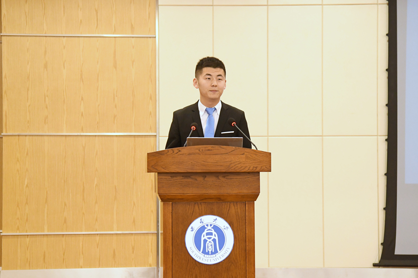紧接着,毕业生代表张健发言。他认为,在机会与挑战并存的就业环境之下,毕业生应树立正确的就业观,做好充分求职准备,主动出击,把握机会,成就自我。他还提醒同学们在求职过程中也需要有防范意识,保护自身权益。