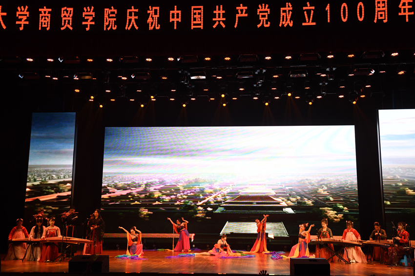 民乐伴舞《鼓乐齐鸣颂华夏》、民族舞《朗月幽映竹林深》、古典舞《鸾回凤翥舞霓裳》以及歌伴舞《百年风雨新征程》,委蛇姌袅,袖如回雪,以婉转的舞姿与美妙音乐赞颂了党的生命和事业始终洋溢着勃勃向上的青春脉动。