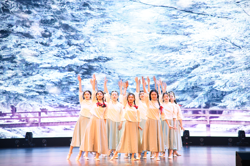 现当代舞《傲雪斗霜展笑颜》表现了革命期间中国共产党不畏寒霜、乐观向上的斗争情怀。