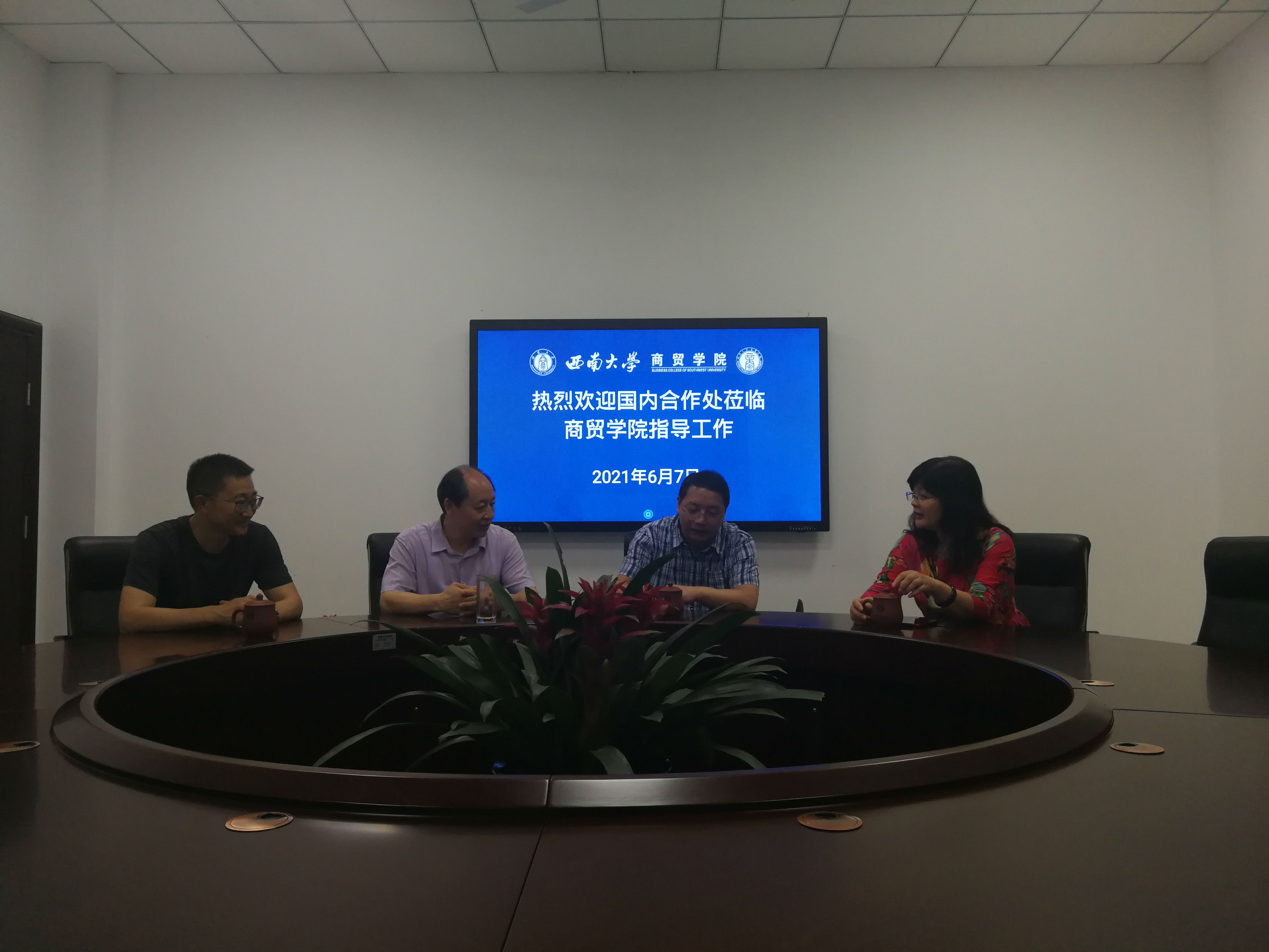 6月7日下午,世俱杯sjb官网国内合作处杨明厚副处长一行在荣昌校区参加会议后,挤出时间赴世俱杯sjb官网开展工作调研。世俱杯sjb官网党委书记周国安、院长李晓阳向杨明厚副处长等人汇报了当前学院在国内合作、社会服务工作方面基本情况和未来工作打算。