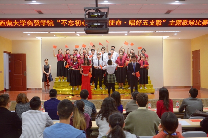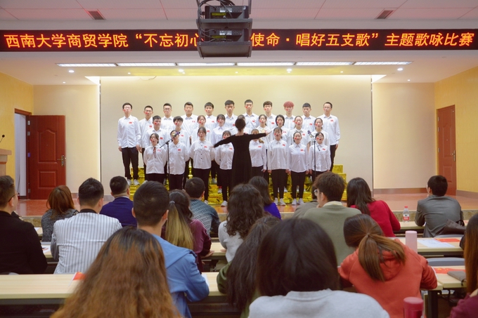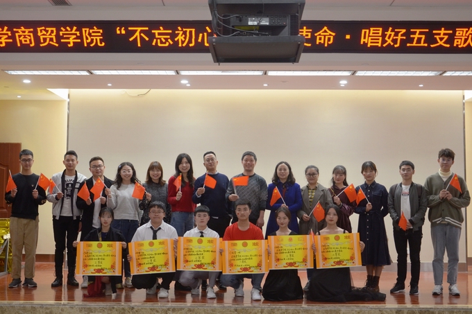为庆祝祖国七十华诞,激发同学们爱党爱国爱校热情,丰富校园文化生活,10月24日,学院举办“不忘初心,牢记使命,唱好五支歌”主题歌咏比赛总决赛,学院党委副书记、纪委书记兰英,团委书记廖鹏及全体辅导员,校区艺术团团长蒋佳君同学、爱乐协会会长帅继波同学出席并担任评委。