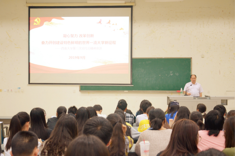 26日晚,兰英副书记为2018级学生作了宣讲。她在会议上指出,今后五年将是学校全面建成特色鲜明的高水平综合性大学的五年,将是学校办学水平和综合实力全面增强并向研究型大学转型的五年,将是建设特色鲜明的世界一流大学破题起步的五年。她就学校未来五年的重点任务进行了分析,从党建工作六项任务、双一流建设六大战略、改革攻坚四个重点、美丽西大四个校园等四方面阐述党代会的精神。