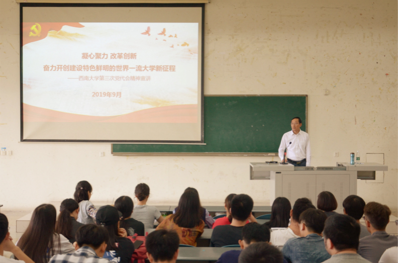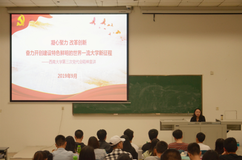 为进一步学习贯彻学校第三次党代会精神,及时把全校师生的思想和行动统一到党代会精神上来,在学院迅速掀起学习和宣传大会精神的热潮,学院党委组建宣讲团,对学生开展学校第三次党代会精神集中宣讲工作。9月26日至9月27日,党委委员纷纷走上讲台,宣讲会分年级分专业展开。
