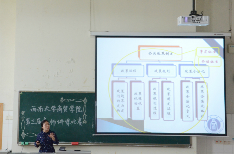 比赛中,各位参赛教师用生动的语言、真实的案例与细致的讲解,吸引了现场观赛师生,展现了教学相长的课堂氛围。王静老师以“死亡指标——公共政策制定中的价值取向”进行讲解,以真实煤矿事故为案例,围绕公共政策制定中的价值取向,进行深入分析。蔡睿老师通过讲解例题,为同学们介绍了公务员考试的相关技巧;葛法权老师则利用视频,形象地展示了中外文化差异,进行跨文化对比。