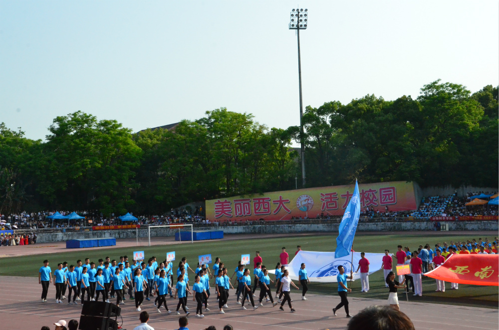 逐梦新时代,开启新篇章。4月19日上午,以“美丽西大,活力校园”为主题的世俱杯sjb官网第十三届田径运动会在第二运动场隆重开幕。校党委书记舒立春、校长张卫国等学校领导,各二级学院主要领导以及各学院师生代表方阵出席了开幕式。世俱杯sjb官网本次派出60人组成的学生代表方阵,作为第11方阵入场,首次亮相校运会开幕式。学院党委副书记兰英作为领队走在前列,向全校师生展示了商贸风采。