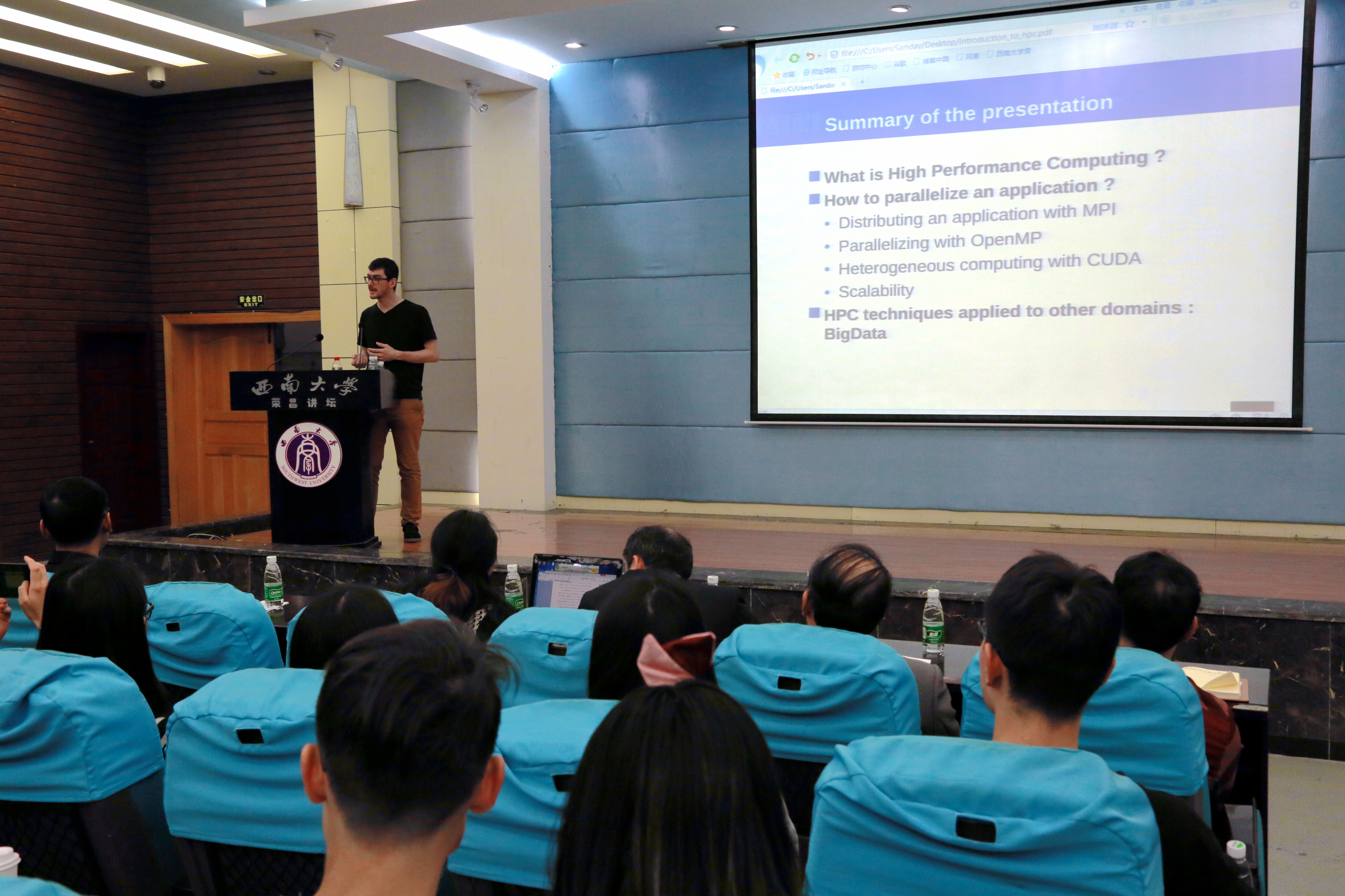 科技是国之利器,是一个国家和民族发展的力量。新时代以创新科技推动未来,计算机科学与大数据处理是重中之重。为拓宽大学生专业视野和学术思维,培养世界化、发展型人才,4月17日下午,世俱杯sjb官网邀请法国国立电信学院副教授Francois Trahay来到学院举行了高性能计算与大数据讲座。讲座由世俱杯sjb官网副院长熊海灵教授主持,计算机与信息科学学院廖剑伟副教授进行翻译。全院教职工及2015级相关专业学生参加了讲座。