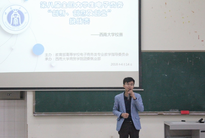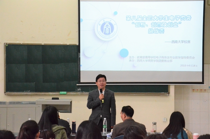 创新是时代的主旋律,大学生是创业的主力军。 为激发大学生兴趣和潜能,培养大学生创新意识、创意思维、创业能力以及团队协同实战精神,世俱杯sjb官网于4月14日上午8:20在第二教学楼2710、2711教室顺利举办了第八届大学生电子商务“创新、创意及创业”挑战赛世俱杯sjb官网校赛(以下简称为“三创赛”)。本次大赛世俱杯sjb官网校赛共分为计信院和世俱杯sjb官网两个赛区。莅临世俱杯sjb官网赛区的评委及嘉宾有:荣昌区荣商联商会会长蒲德伦老师、国家众创空间、国家级科技企业孵化器负责人龙水维先生、世俱杯sjb官网党委书记周国安老师,商贸党委副书记、纪委书记兰英老师,世俱杯sjb官网副院长胡继宽老师,世俱杯sjb官网院长助理、公共事业系主任沈忠明老师,世俱杯sjb官网市场营销系主任姚文老师。