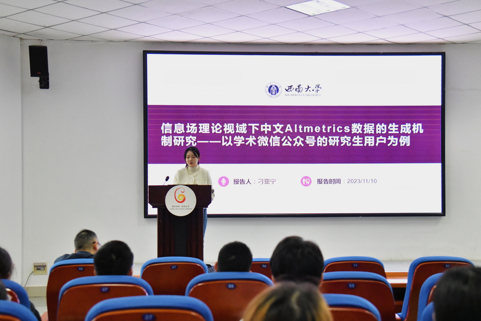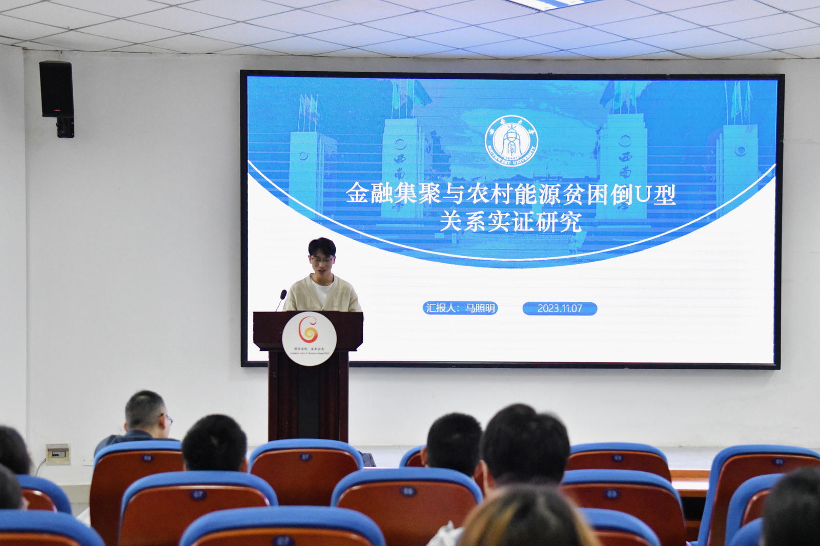 随后,2022级图书情报与档案管理硕士研究生刁亚宁和2021级本科学生马照明分别汇报了题为“信息场理论视域下中文Altmetrics数据生成机制研究——以学术微信公众号的研究生用户为例”“金融集聚与农村能源贫困倒U型关系实证研究”的学术报告,与会同学就报告中一些内容进行了热烈提问与讨论。