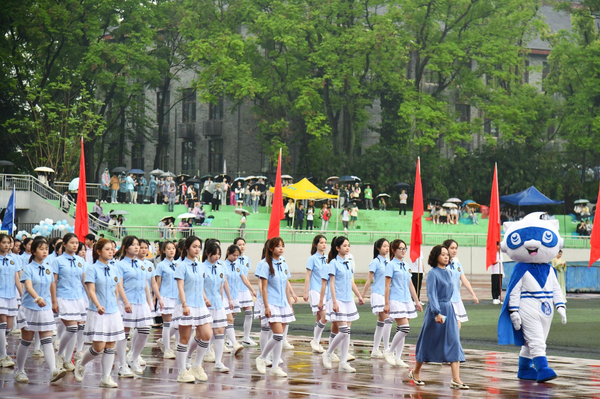 在19日举行的开幕式中,院旗飘扬,风击鼓动,滴滴雨点,浇不灭心中热情。学院方队服装统一,队伍整齐,步伐坚定有力,开场舞热情洋溢,展现出我院学子青春的活力和昂扬饱满的精神。