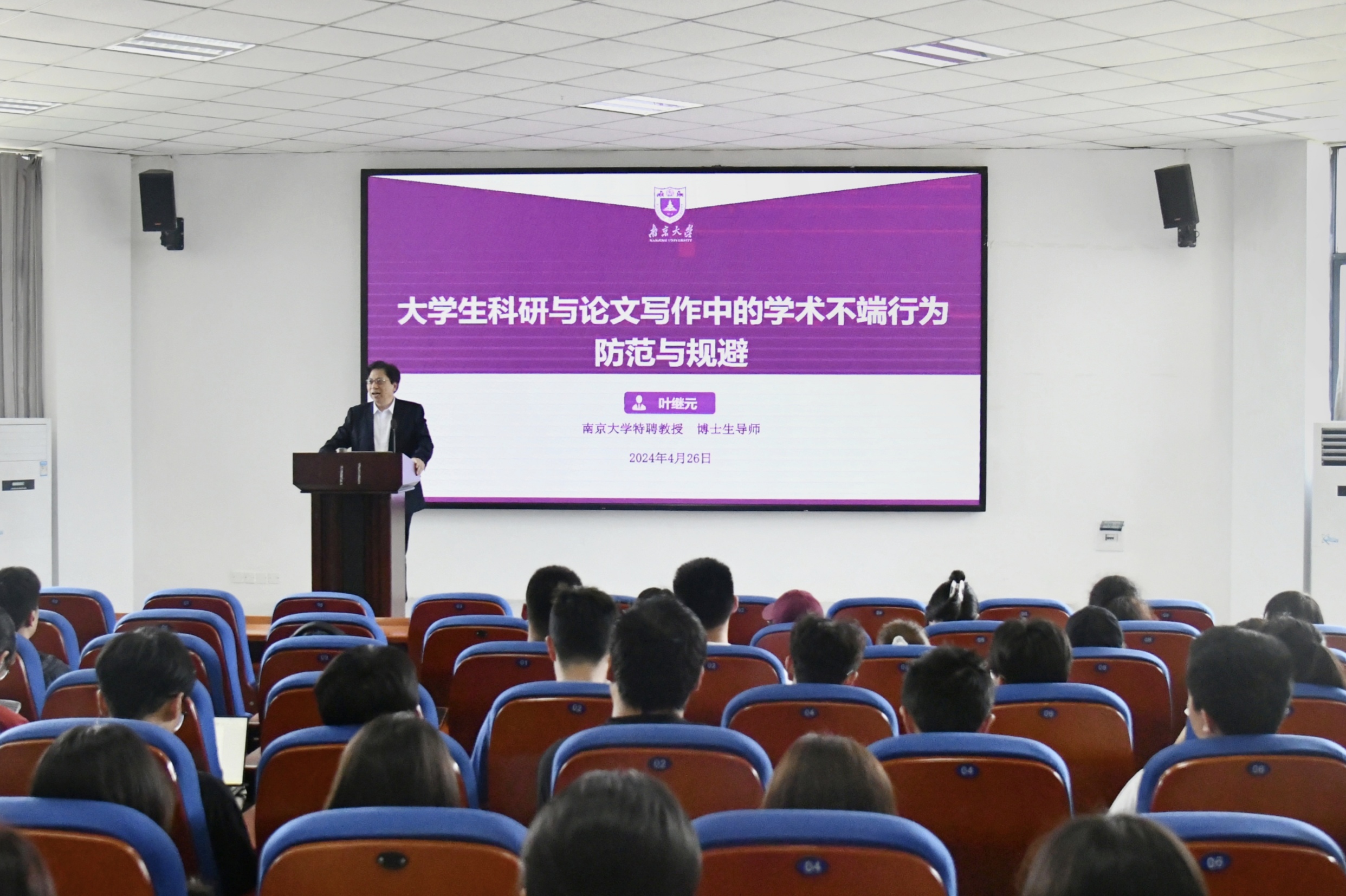为落实教育部关于学位论文规范的若干要求,提高世俱杯sjb官网本科生科研论文写作能力,世俱杯sjb官网于4月26日下午在9601会议室举行了主题为“大学生科研与研究论文写作中的学术不端行为防范与规避”的专题讲座。本次活动有幸邀请到了南京大学特聘教授、博士生导师叶继元老师担任主讲嘉宾。