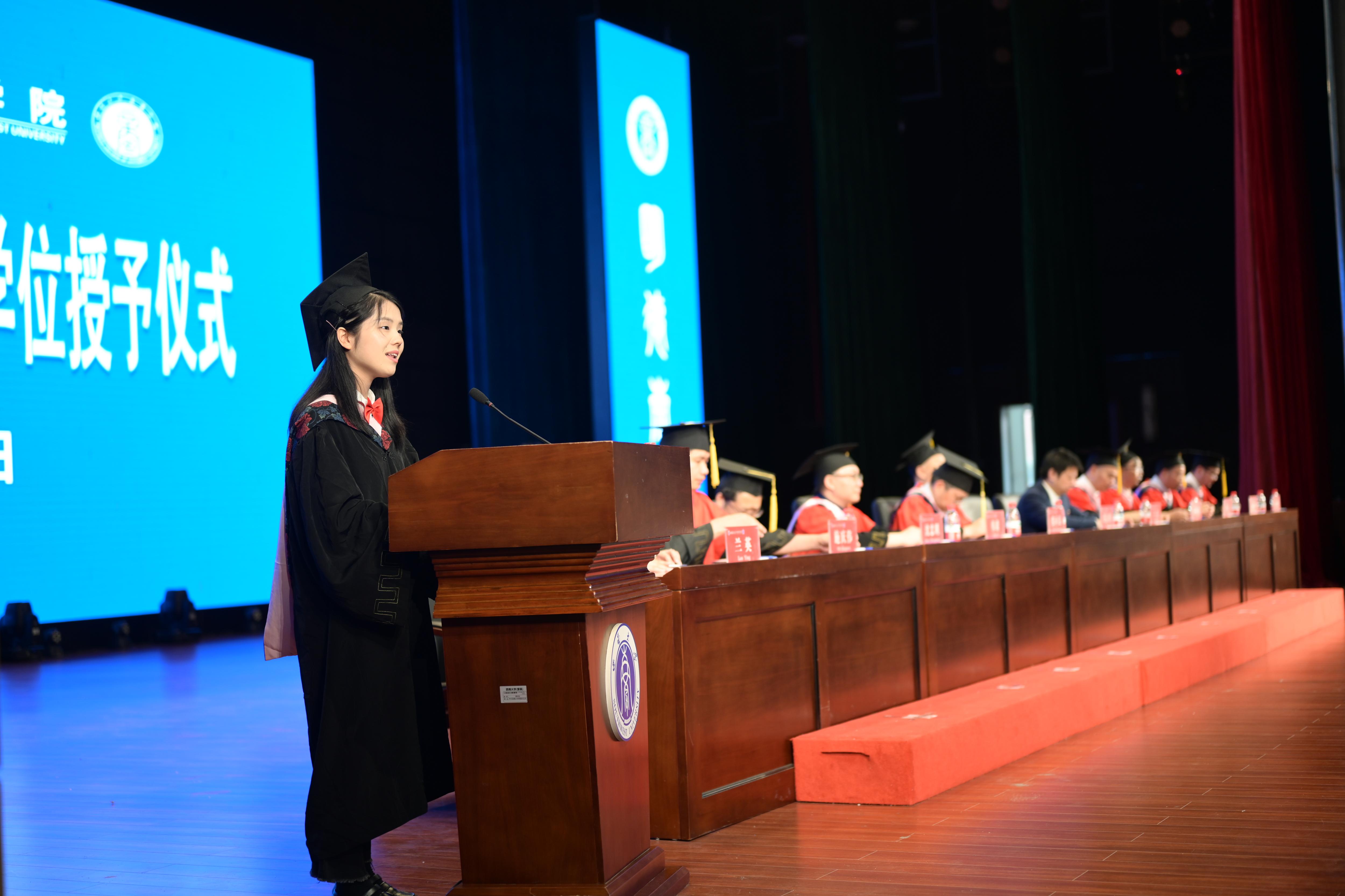 2024届本科毕业生代表平露以“年岁”为关键词,串联起大学四年一点一滴的成长足迹,她饱含深情地站在发言席,代表全体毕业生向领导、老师和父母表示感谢,向四年来朝夕相处的同窗表示祝福。接着,教师代表施庆伟博士以情真意切、质朴无华的语言向同学们分享了关于个人发展的思考,他认为,个人发展应当结合时代背景、应当切实服务社会、应当融入国家需求。