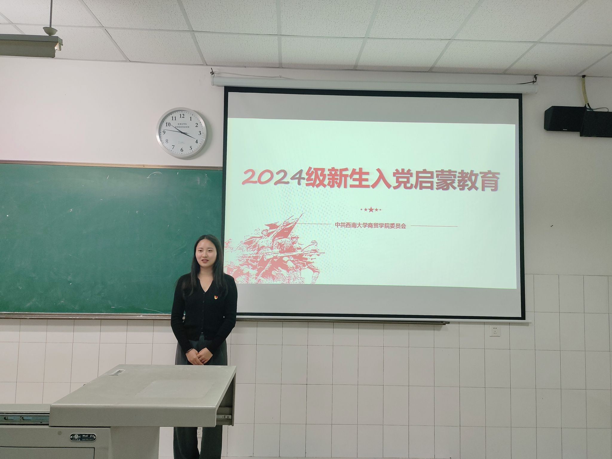 2024年9月14日,王玥同志以“新时代青年的责任与担当”为主题,对全体2024级研究生开展了入党启蒙教育。她概括了党的基本知识,明确入党要求,并指导撰写入党申请书。