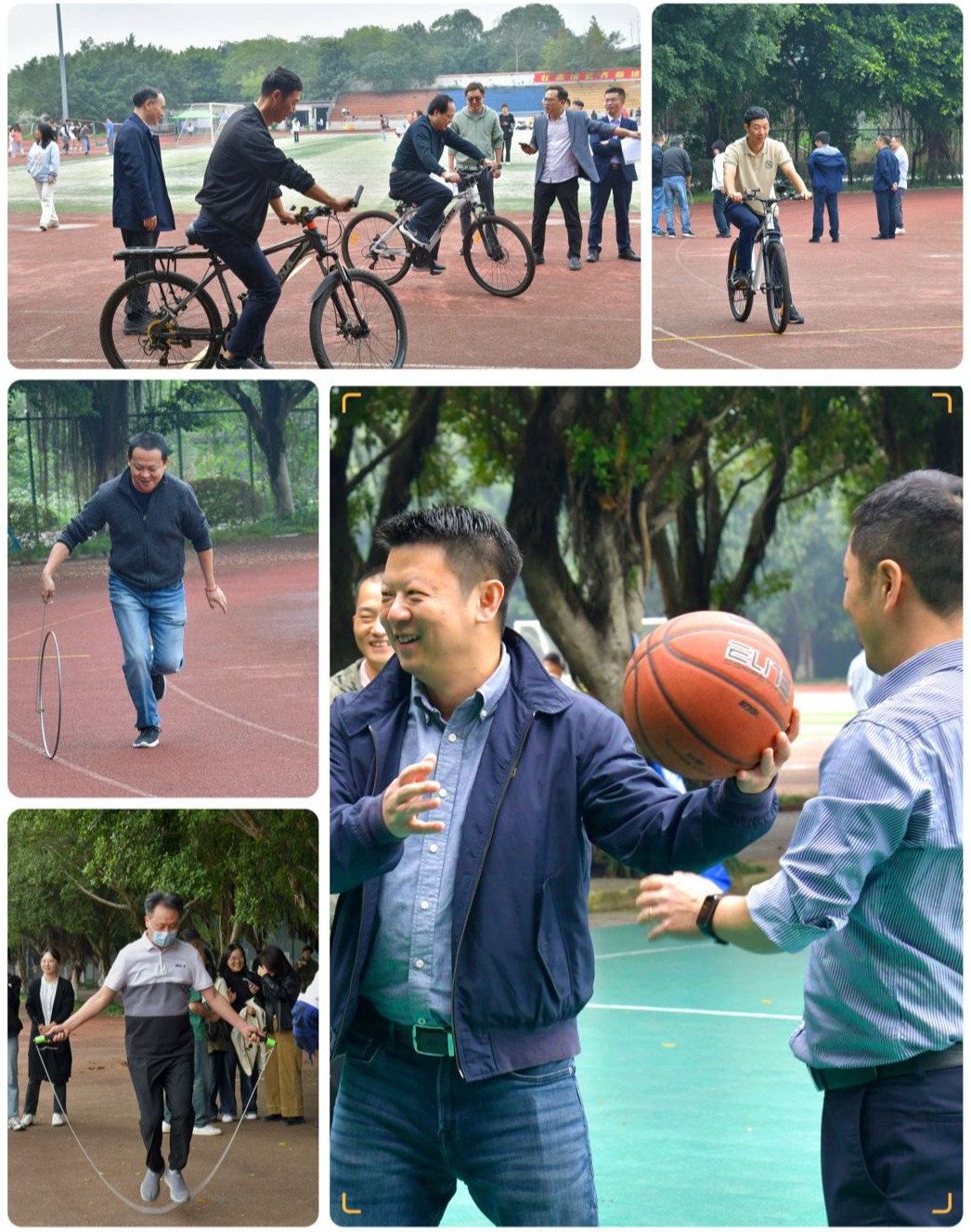 此外,学院全体教职工也参与到本次运动会中。老师们在自行车、滚铁环、跳绳和投篮等趣味活动中尽情挥洒汗水,放松身心,体验乐趣,与同学们一起享受这体育盛会。