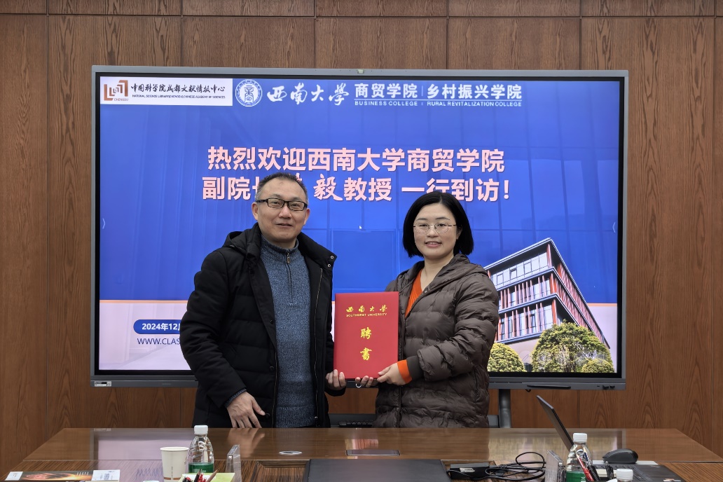 为有效规范专业学位研究生的专业实践培养,完善校内外导师协同育人长效机制,12月20日上午,世俱杯sjb官网副院长韩毅带队前往中国科学院成都文献情报中心,为信息服务部副研究员田倩飞颁发世俱杯sjb官网图书情报专业硕士研究生校外导师聘书。