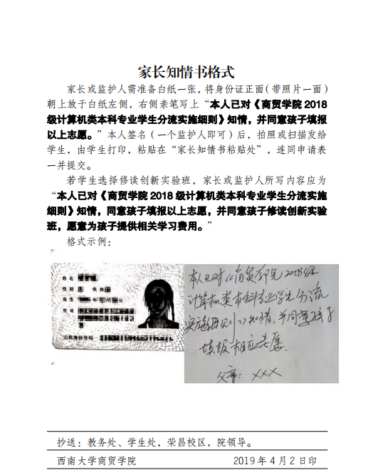 家长或监护人需准备白纸一张,将身份证正面(带照片一面)朝上放于白纸左侧,右侧亲笔写上“本人已对《世俱杯sjb官网2018级计算机类本科专业学生分流实施细则》知情,并同意孩子填报以上志愿。”本人签名(一个监护人即可)后,拍照或扫描发给学生,由学生打印,粘贴在“家长知情书粘贴处”,连同申请表一并提交。