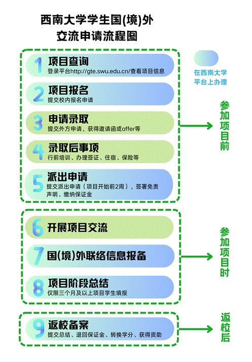 1. 参加项目,学生需登录“世俱杯sjb官网学生全球化学习管理平台”(简称:平台http://gte.swu.edu.cn/)完成校内报名、派出、及返校备案流程,此过程是获得学校专项经费资助以及认定国际学分的必要条件。