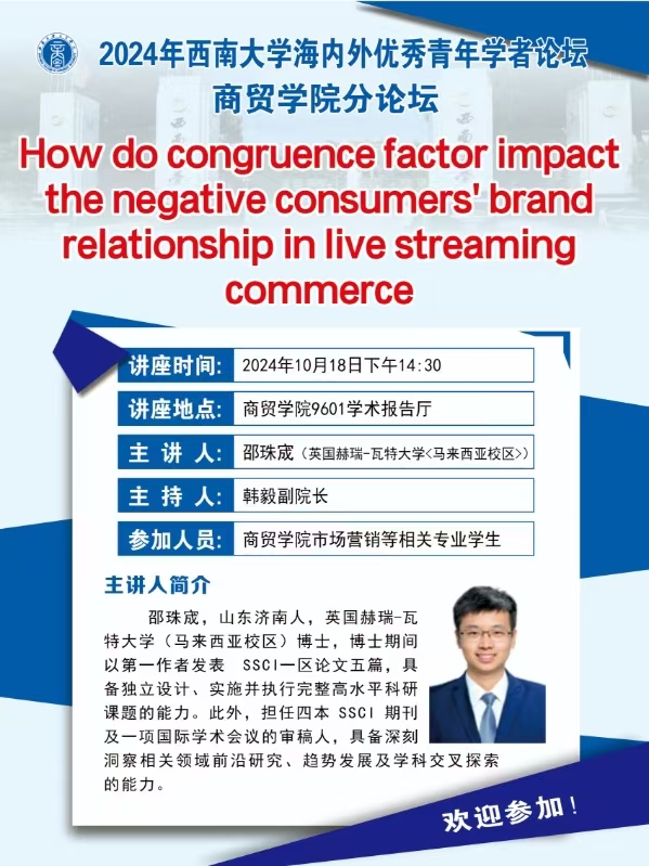 学术讲座:How do congruence factor impact the negative consumers' brand relationship in live streaming commerce