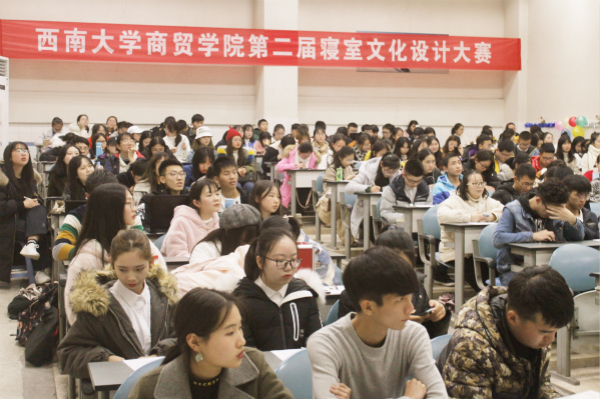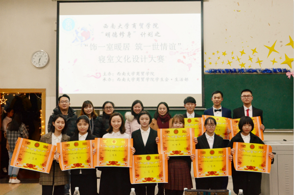 为展示学生寝室文化特色,增强学生集体荣誉感,营造具有归属感与温馨感的学习生活氛围,提升学生的创新意识,学院于12月7日下午在2710教室举行了“明德修身”计划之“饰一室暖居,筑一世情谊”寝室文化设计大赛决赛。学院党委副书记、纪委书记兰英老师,学院辅导员刘莉莉老师、牟凯伦老师、谭觅老师、石晶莹老师出席了此次活动。