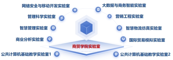 目前共建设有八个专业课实验室,服务于学院国际经济与贸易、市场营销、物流管理、信息管理与系统以及大数据管理与应用等专业的实验教学。另建有两个公共计算机基础教学实验室,主要服务于荣昌校区四个学院的计算机基础课程实验教学(见图1-2)